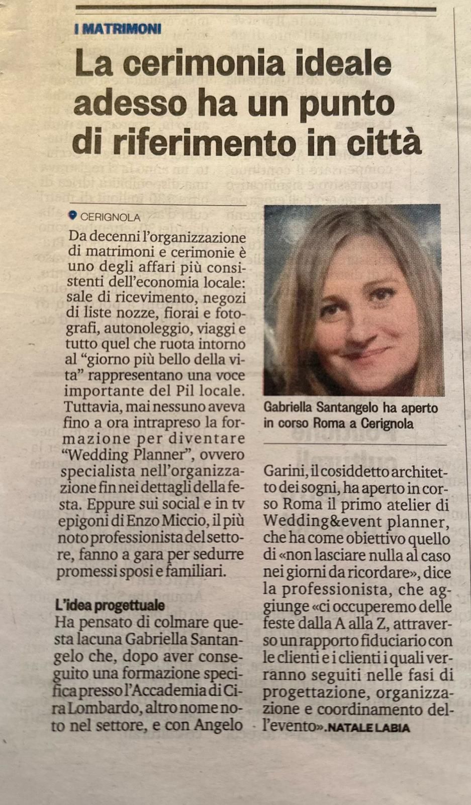 Gabriella Santangelo è la tua wedding planner personale e event planner di fiducia a Cerignola, specializzata nell'organizzazione di matrimoni ed eventi unici. Con anni di esperienza e una passione travolgente, Gabriella trasforma i tuoi sogni in realtà, curando ogni dettaglio con attenzione e professionalità. Che si tratti di un matrimonio da favola, di un battesimo, di una festa privata o di un evento aziendale, il risultato sarà sempre impeccabile e memorabile.